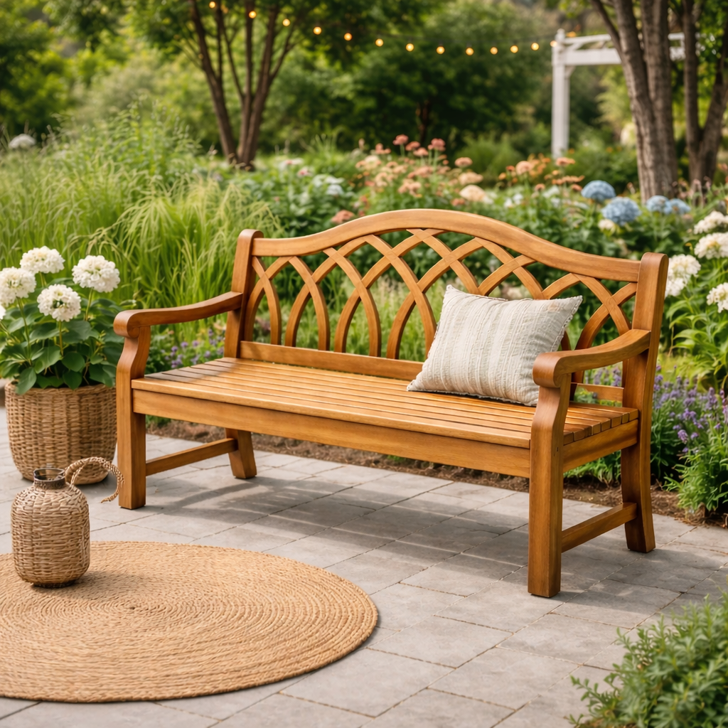 Diese Gartenbank bietet eine praktische Sitzmöglichkeit für Garten, Terrasse oder Balkon. Die Sitzfläche und Rückenlehne bestehen aus stabilen Holzlatten, die eine angenehme und gleichmäßige Sitzfläche bieten. Das Gestell sorgt für eine solide Konstruktion und unterstützt eine zuverlässige Nutzung im Außenbereich. Die Bank eignet sich für den Einsatz im Garten, im Innenhof oder auf der Terrasse und bietet Platz für zwei bis drei Personen.